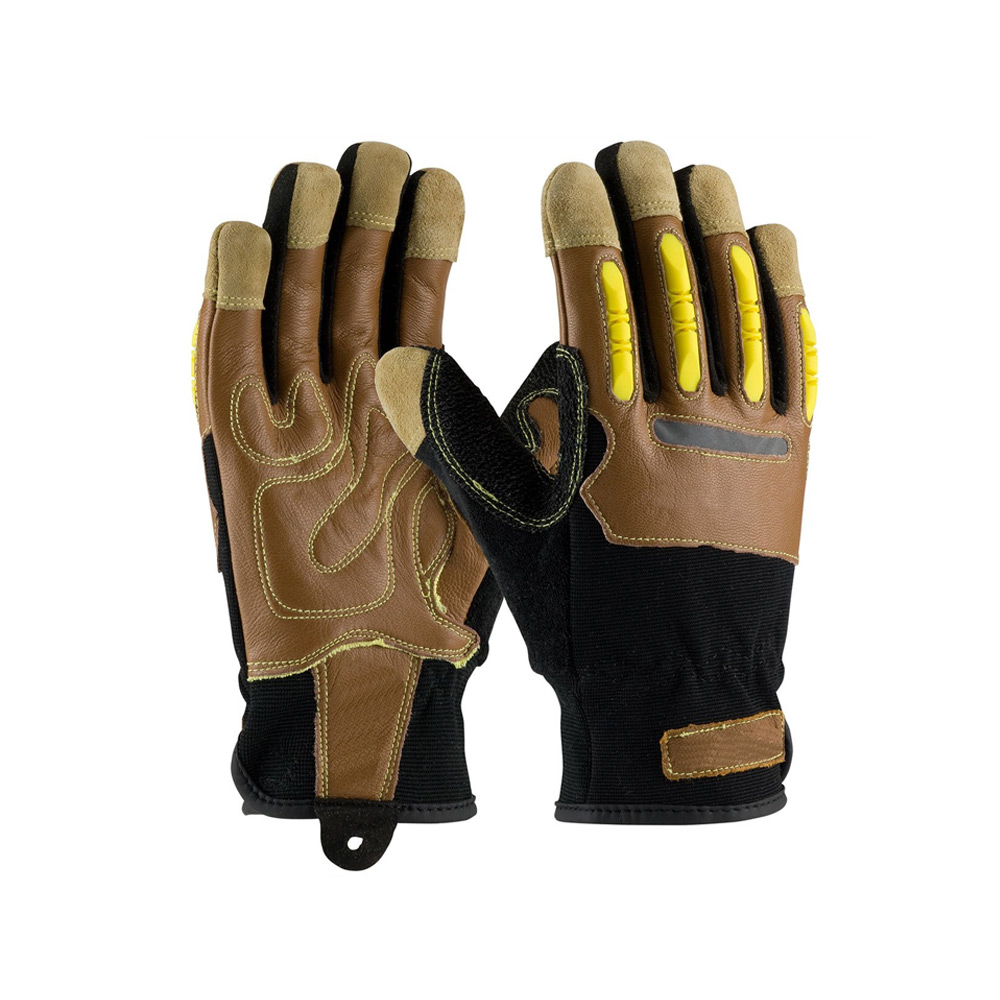 Reinforced Goatskin leather palm and back provides the softest, most abrasion-resistant leather and is highly recommended for applications requiring tactile sensitivity. Split Goatskin leather fingertips for added protection. Internal foam padded palm absorbs and dampens shock. Thermo Plastic Rubber (TPR) molded knuckle guards for maximum protection. Nylon spandex fabric for comfort and breathability. Reflective knuckle tape makes this product easy to see in low-light applications. PVC sandy grip on thumbcrotch and thumb provides an enhanced grip and extra cut/abrasion resistance. Micro cotton thumb for comfort. Hook & loop closure for easy on/off and a secure fit. Launderable for extended life and to reduce replacement costs.